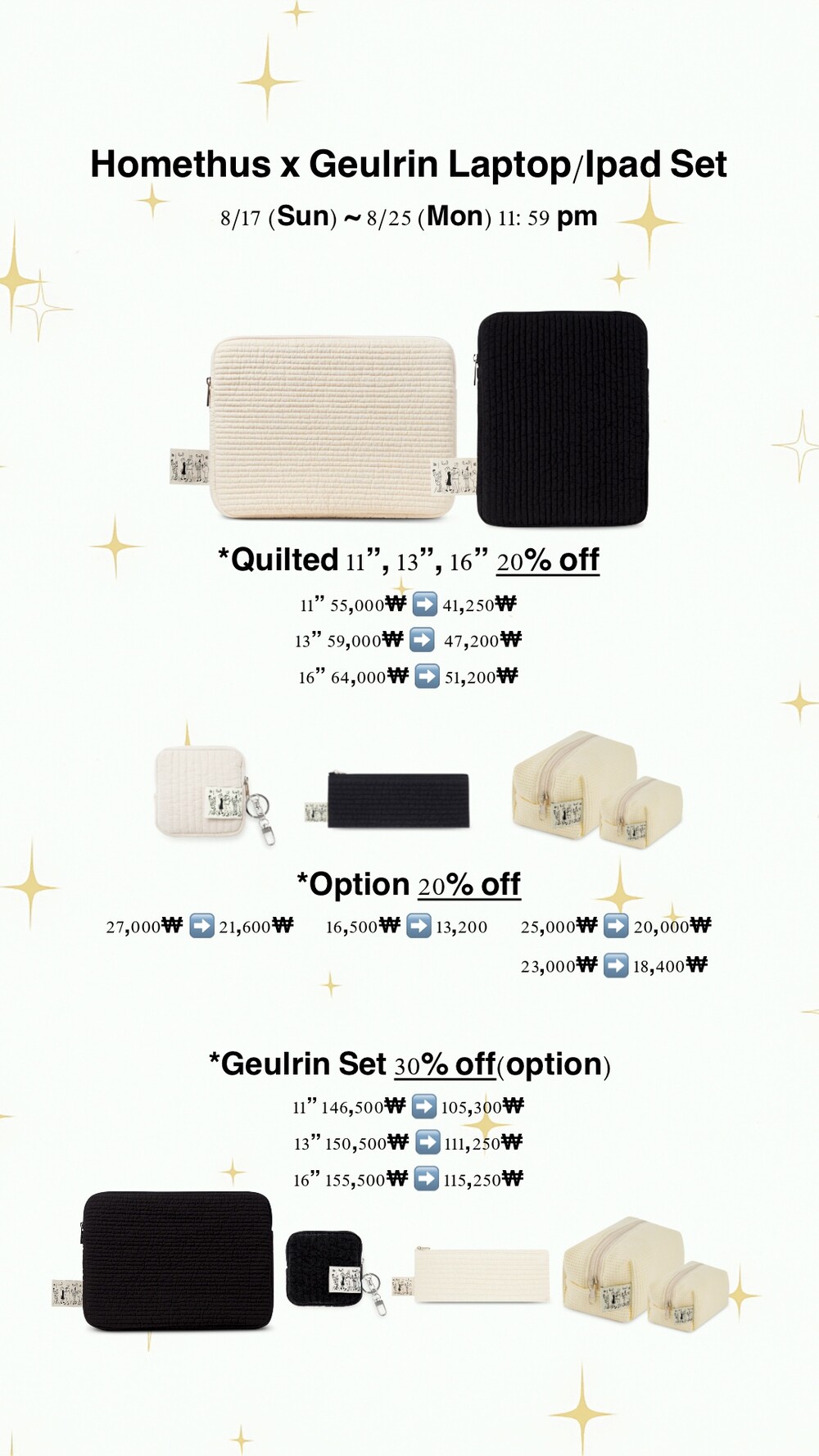 당신의 소중한 노트북, 아이패드를 보호해 줄 퀼티드 파우치, 그리고 홈더스 파우치를 특별한 가격으로 만나보세요!