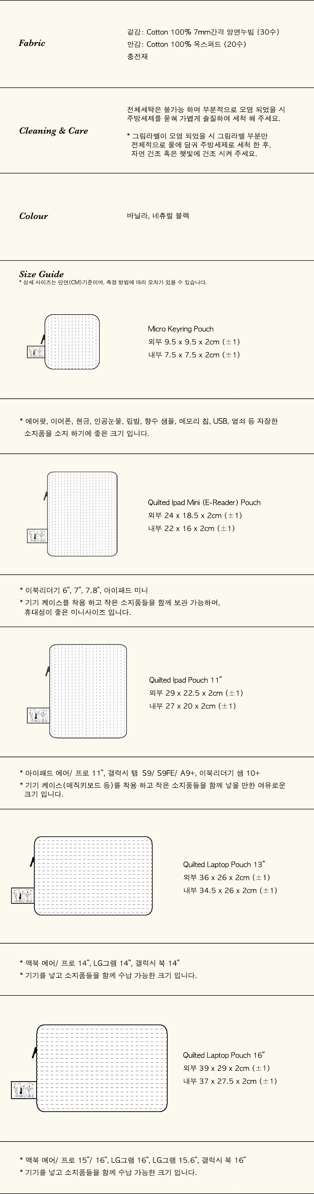 내부는 부드러운 면 소재로 되어있어 스크래치 걱정 없이 사용 가능하며, 도톰하고 폭신한 충전재가 내장되어 있어 보호력이 뛰어납니다. 또한 포켓이 있어 소지품을 분리하여 수납 가능합니다.