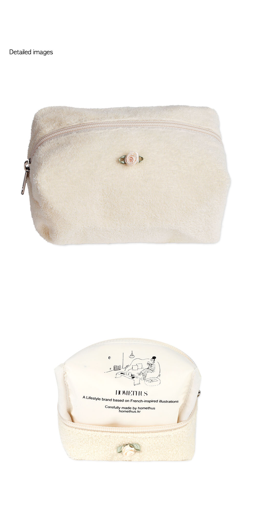 Description 은은한 소프트 크림 색상에 코사지 장식 포인트의 조합이 매력적인 파우치 입니다. 타올처럼 부드럽고 폭신한 테리 소재감을 느낄 수 있으며, 은은한 광택감이 흐르는 생활 방수 안감 소재를 사용하여 고급스러움을 더했습니다. 안감에 홈더스 시그니쳐 일러스트 로고 프린팅을 하여 홈더스만의 디테일을 엿볼 수 있습니다. S, M 두 가지 사이즈로 제작 되었으며 모두 넉넉한 수납력을 자랑하여 기호에 맞게 사용 가능합니다.