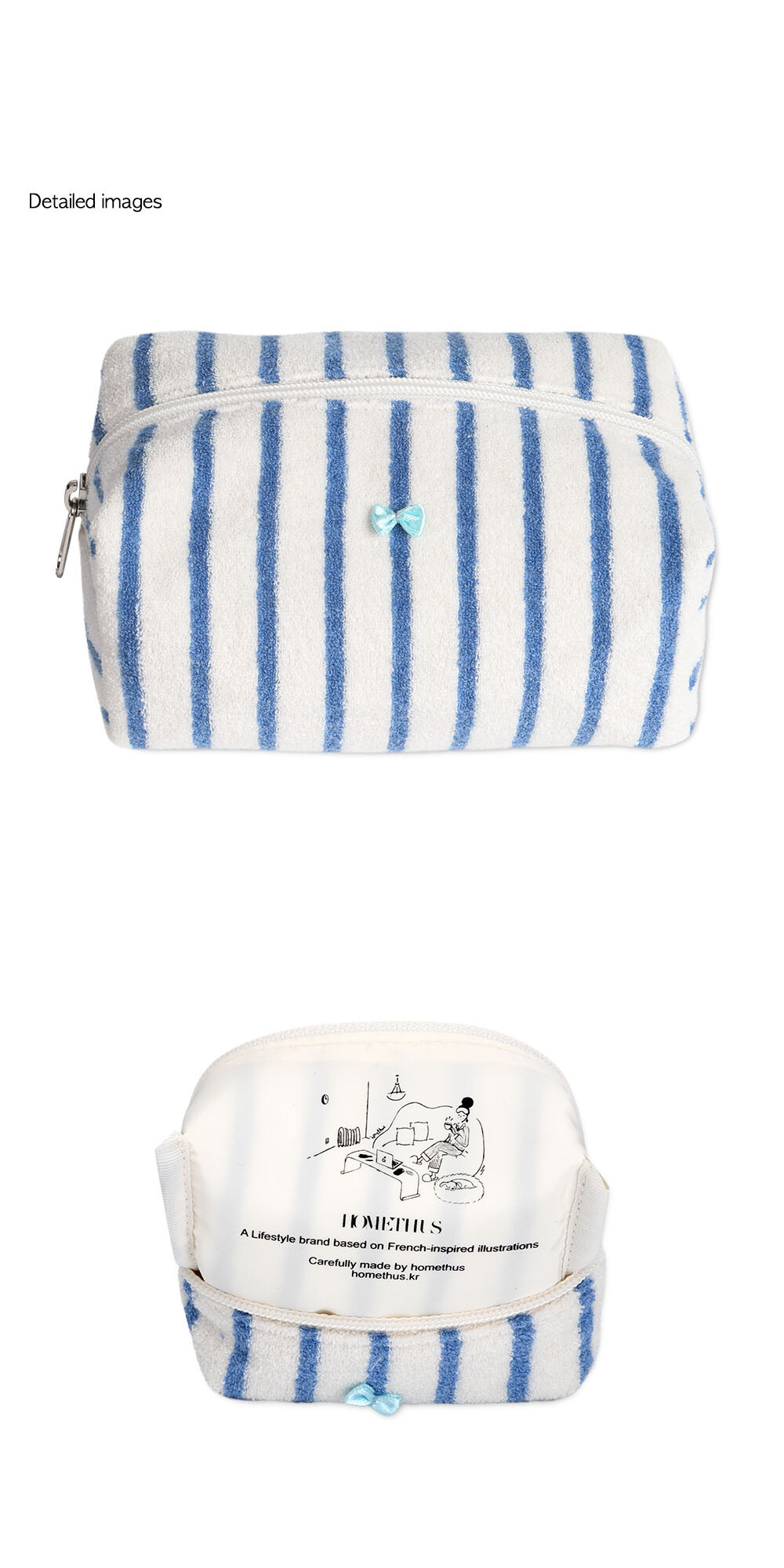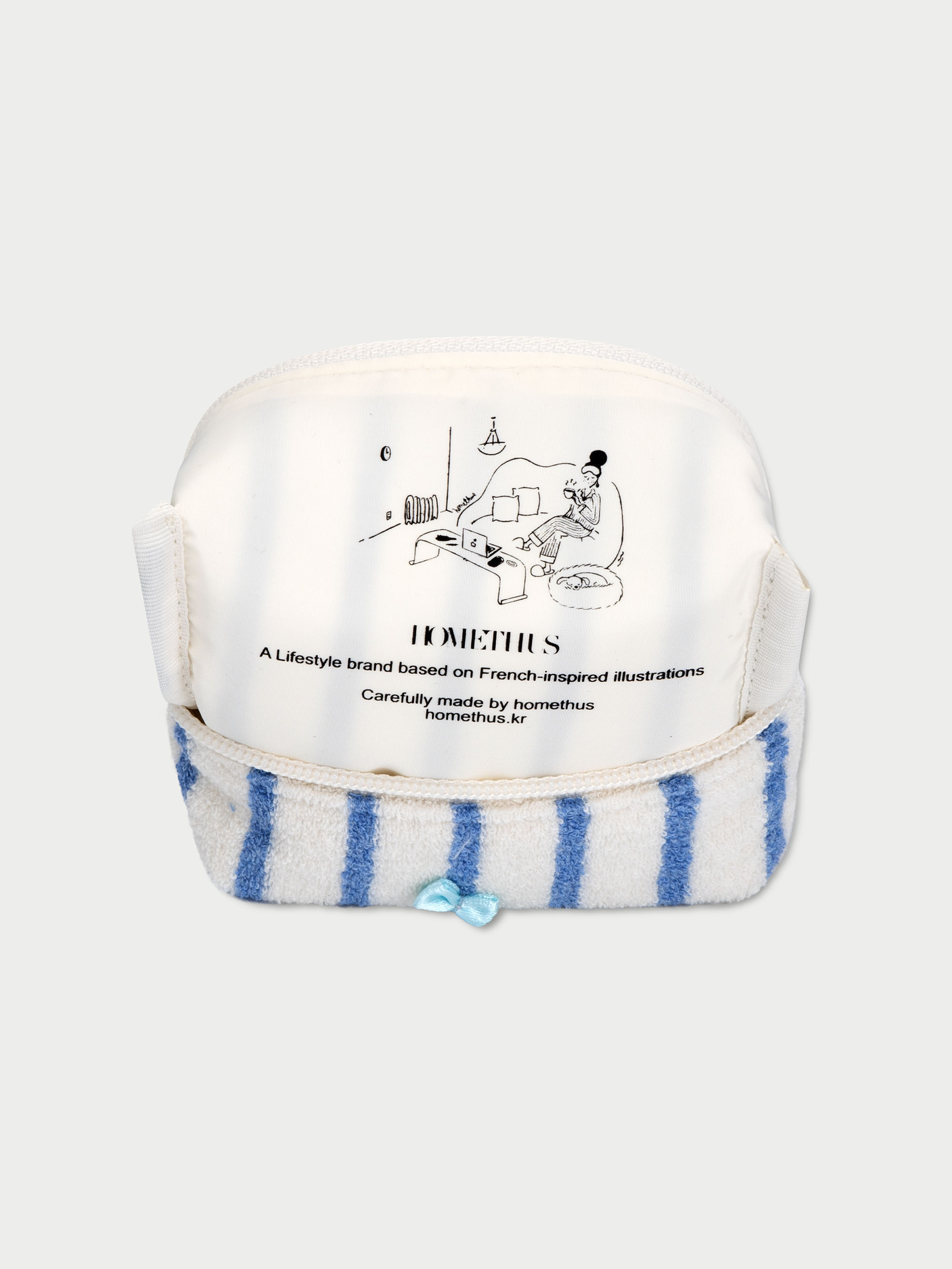 Description 블루 스트라이프 패턴의 테리 소재에 하늘색 미니 리본 장식 포인트의 조합이 매력적인 파우치 입니다. 타올처럼 부드럽고 폭신한 테리 소재감을 느낄 수 있으며, 은은한 광택감이 흐르는 생활 방수 안감 소재를 사용하여 고급스러움을 더했습니다. 안감에 홈더스 시그니쳐 일러스트 로고 프린팅을 하여 홈더스만의 디테일을 엿볼 수 있습니다. S, M 두 가지 사이즈로 제작 되었으며 모두 넉넉한 수납력을 자랑하여 기호에 맞게 사용 가능합니다.